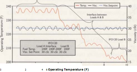 理解為什么混合物粘度有所不同負(fù)荷負(fù)荷只有一塊拼圖。結(jié)果如何理解不同的粘度是另一回事。不同等級(jí)的船用重油當(dāng)形式層儲(chǔ)存在相同的儲(chǔ)油罐。作為一個(gè)結(jié)果,以維持粘度設(shè)置點(diǎn)、燃油的燃燒控制系統(tǒng)必須應(yīng)對(duì)急劇變化時(shí)對(duì)燃油粘度變化之間的接口的掩體滿足燃油駁運(yùn)泵抽吸。(見圖查看插入的一個(gè)例子IF0120不同負(fù)荷)。圖說明了一個(gè)相當(dāng)大的變化IF0120粘度的層之間所負(fù)荷圖作為°和°B。這需要改變粘度降低燃料溫度從240°F到200°F為了保持粘度設(shè)置點(diǎn)上30 cst。認(rèn)為會(huì)發(fā)生什么事假如操作者僅靠一個(gè)理論溫度設(shè)置點(diǎn)來自典型的燃料燃燒曲線。小費(fèi)會(huì)犯規(guī)燃燒器更加頻繁的排放會(huì)受到不良影響。