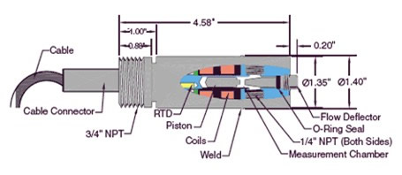 位于活塞上方的導流裝置,將液體導入測量室,活塞持續運動以不斷更新樣品,同時機械摩擦不斷擦洗測量室。 一個內置的RTD溫度測量探頭,實時測量測量室的溫度。